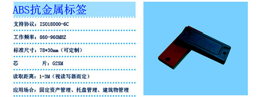 結合市場需求,推陳出新,推出ABS抗金屬標簽,PCB抗金屬標簽,更有王牌圖書館標簽,和一系列智能卡。1、ABS抗金屬標簽ABS抗金屬標簽,采用耐高溫工業ABS塑料/金屬屏蔽材料/環氧樹脂罐封耐高溫,最高可承受200攝式度的溫度。對化學物質也有非常強的抵抗作用,PH值7正反4范圍內基本不會受到影響。