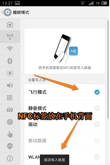 2、比如我們打開睡眠模式,將手機(jī)設(shè)置為飛行模式,如果你有其他的偏好,也可以自行修改添加。設(shè)置好之后,手機(jī)背面掃描一下NFC標(biāo)簽,就會提示“成功寫入標(biāo)簽”的字樣了。