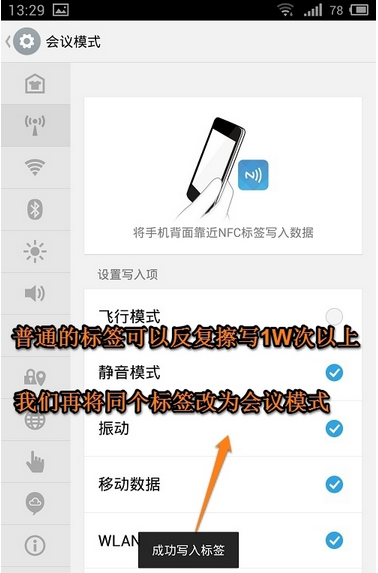 1、有時候我們需要將NFC里的數(shù)據(jù)更換或者是重新設(shè)置,這個時候怎么辦呢?其實(shí)方法很簡單的,和“寫入標(biāo)簽”的方法是一樣的,比如小編要改為“會議模式”。
