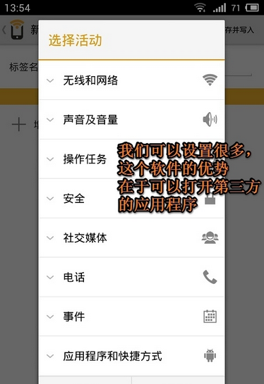 我們除了控制手機(jī)的基本功能外,我們還可以控制某些應(yīng)用程序的開啟,或者發(fā)短信給某個人,打某個人的電話。注意,魅族MX3自帶的NFC功能還無法開啟第三方應(yīng)用程序,需要其他軟件的支持。